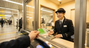 ICカードや切符を持って、改札の横にある駅員さんのいる窓口へ行きましょう。