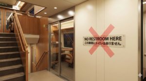 もよおして限界が近づいてから席を立つと、階段を降りて、デッキを通り、さらに隣の車両へ移動するという長い道のりに絶望することになります。