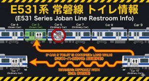 常磐線の車両(E531系)は、トイレの配置が特殊です。